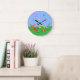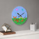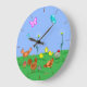 Hönor och kycklingar springer runt på gårdsplanen med fjärilar och svamp.