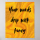 The Honey Drip art print is a sweet reminder of your precious words. This poster features a golden swirl design with black text reading "Your words drip with honey." This is the perfect addition to your home!