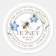 Vattenfärgade honungsbin och vintage blåblommor på vit bakgrund. "Honung" skrivs i ett dekorativt teckensnitt.