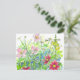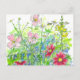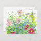 Ett färgstarkt vykort för blommigt med gult-bilder, ljusa rosa-kosmos, kamomill och rosa-vilda blommor med en besökande honungsbin som dras i pennan och bläck med vattenfärg.