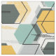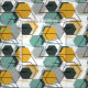 Honeycombs. Abstraktens geometriska mönster. Grått, senap, turkos figurer på vitt.