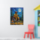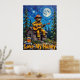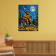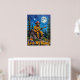 Denna hjärtslitande konst fångar en björn klädd i brandkårer, inklusive en hjälm och solglasögon, som spelar en akustisk gitarr när den sitter på tak i en quaint-trästuga. En stor, glödande fullt måne och spridda stjärnor fyller den texturerade natten himmel, med evergreen träd på vardera sidan. En burk av honung med en dipper vilar nära kabinbasen och "Kärlek My Honung" är tydligt synlig. Målarens tjocka, texturerade linjer ökar bildens överhängande kvalitet.