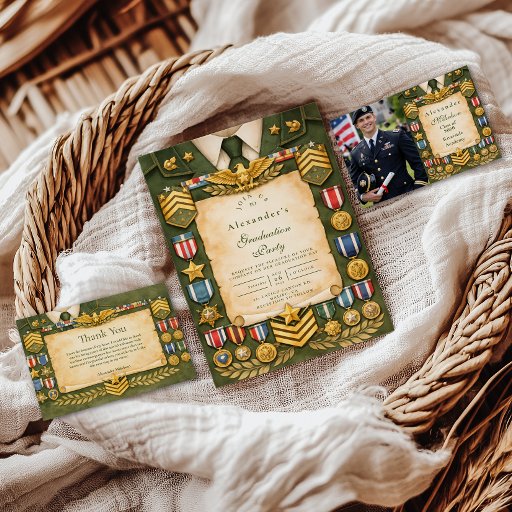 Celebrate a major milestone with this vintage-inspired patriotic graduation design. Featuring classic military-style insignias, laurel wreaths, banners, and a timeless parchment center, this invitation is perfect for honoring a graduate with strength, pride, and tradition. Ideal for formal or themed graduation celebrations with a bold, heritage-inspired aesthetic.