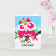 Hoo-Ray, det är din födelsedag, den vackra födelsedagen Uggla, pappert hälsningskort. Kortet är en söt illustration av ett rosa uggla med stort ögon, en uggla pun och en mörk färgad gren med ljust grönt löv. En lustig födelsedagsfest med rand och en lila pompom sitter på ugglans huvud. Art, bild och versa © Shoaff Ballanger Studios.