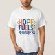 T-shirt har en djärv, konstnärlig stil med citatet "Hope Fuels Progress". Varje ord är ett annat dynamiskt färg som ställs mot en skarp vit bakgrund för en modern och öga-fångstdesign. Texten är centrerad och utformad för läsbarhet, skapar ett kraftfullt påstående av optimism och framsteg.