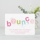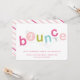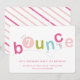 Denna inbjudan till hopp-födelsedagsfest har studsande bokstäver i ett rosa färgschema med varmt rosa, ljust rosa, limegrönt och akvafärg med redigerbar ålder i O. Ett superkul och extra flickigt twist på en trampolin-, gymnastik- eller hopphus-fest. Denna inbjudan är inspirerad av alla små flickor som gillar att hoppa, studsa och flyga. Klicka på redigera för att anpassa.