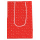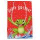 Glad grön groda hoppar ut ur blått vatten på vit prickmönster och röd bakgrund.