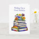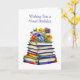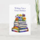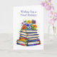 Ett födelsedagskort för en vän som kärlek bokar och läser. Bilder av en vattenfärgad illustration av en stapel av söt vintage bokar täckt i blått och gula blommor, gjord i ett stil i vattenfärg. Insidan är en färgsida.
