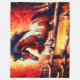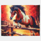 En kraftfull häst svävar i luften över ett trästaket, dess muskulösa form framhävd av elddunge orange och gyllene nyanser mot en glödande höstbakgrund. Den flödande manen, den dynamiska kroppshållningen och det intensiva ljuset skapar en känsla av fart och styrka som fångar rå rörelse med slående visuell effekt.