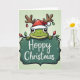 This delightful digital drawing showcases a happy holiday frog 🎅🏼🎄🎁. The frog is a bright green color and wears a Santa hat with reindeer antlers. It has big, expressive black eyes that give off a sense of fun and joy. The frog is adorned with red and green Christmas lights wrapped around its hat and antlers, adding a festive touch. The background is a soft green color that fits well with the main colors of the frog.