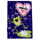 Här är en söt Valentine-presentpåse som också kan användas för födelsedagar eller något speciellt tillfälle. En lycklig grönt grodynga hoppar in i luft från en vit blomstrande liljepad. Ovanför honom är ett vitt hjärta som gränsar till rosa och säger "TOADally kärlek you". Bilden placeras på en mörk lila blå bakgrund med en mängd mjuka rosor. Både fram och bak har samma utformning. Se till att se matchningskortet i vår butik.