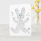 5 x 7 porträtt-hälsningskort - Hoppy Påsk! En stor grått-bunny hoppar i luft och flingar. Han är väldigt lycklig att önska mottagaren en Hoppy Påsk. Ursprungligt teckning är färgpenna på pappra, inlästa och placerade på kortet.