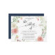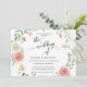 Vågrät 5x7-formatinbjudan. Enkelt. Modern. Elegant. och elfenbensfärgad blommigt i ro med eucalyptus löv andningsfärgsverk skapades av konstnären Audrey Jeanne Roberts. Innehåller: rosa ros parad med elfenbensblommigt ro, eukalyptus löv, sederad eukalyptus, ferner och löv i mjuk mynta och grågrön. Upphovsrätt.