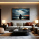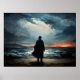 Före ett oroligt hav och en dramatisk himmel stirrar en ensam figur ut i det okända. Skymningens sken inger hopp, medan båten på stranden inbjuder till en resa.