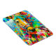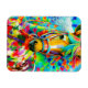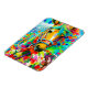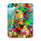 En häst avbildas i en explosion av färg, försedd med flerfärgade blommor och en färgstark mane. Den hårda blandningen av pulserande nyanser mot en ljusblå bakgrund skapar en drömliknande, glatt atmosfär. Hästens uttryck och den livliga utformningen väcker en känsla av och firande.