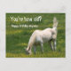 Hästen med huvudet nedåt och det är svan uppe i ett överraskande foto på Birthday-vykortet som frågar "Du är hur gammal?" och inuti texten "Grattis på födelsedagen ändå". Text kan ändras eller tas bort med knappen CUSTOMIZE.