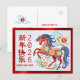 “Happy New Year” red faux foil typography in both Chinese and English and a stunning visual of a graphic multi color cut paper horse, flowers and cloud overlay a traditional Asian light gray circle pattern and brushed red faux foil border on the front. On the back are a colorful cloud and star visual, your personalized note, and return address. Feel the warmth and joy of the holiday season whenever you send this stylish yet modern, personalized 2026 Chinese Lunar New Year of the Horse postcard. Make sure someone special receives this greeting!