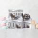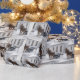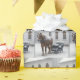 A horse is harnessed to a sleigh in front of a charming, snow-covered building with arched windows, while snowflakes softly fall, enveloping the scene in tranquility
