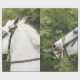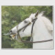 En vattenfärgsdesign av en vacker vit häst som otåligt väntar på att få stryk.