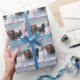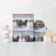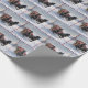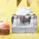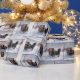 Två svarta hästar drar en sömn fylld med färgat Julklapp genom ett snöslandskap