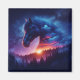 En dramatisk bild av en hästsilhuett som blandas med vibrerande solnedgång omgiven av en drömliknande, serenskog under ett stjärnbelyst himmel.