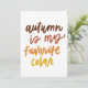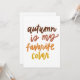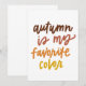 Denna design presenterar frasen "höst är min favoritfärg" i ett stilrent, handskrivet typsnitt. Texten är arrangerad i en staplade, centrerad justering där varje ord har sin egen rad, vilket skapar ett visuellt tilltalande flöde från topp till botten. Färgpaletten är en gradient av varma höstfärger, som övergår från djupbrun högst upp för ordet "höst", till en ljusare, roströd orange för "är min", och slutligen till en levande gul för "favoritfärg". Denna färgövergång speglar inte bara höstflitens rika spektrum utan förstärker också känslan som uttrycks i frasen.