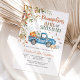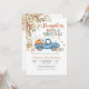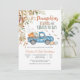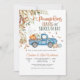 Fira glädjen av en ny ankomst med denna charmiga höst baby shower inbjudan som presenterar en vintage blå lastbil fylld med pumpor, hö och festliga ballonger. Omgiven av fallande löv och säsongens växtlighet, fångar denna design värmen från skördetiden och skapar en mysig, välkomnande atmosfär. Perfekt för höst-tema baby shower, den blandar rustik charm med säsongens elegans för att glädja dina gäster.