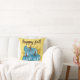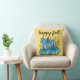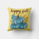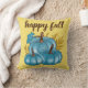 Höst blå pumpor guld kastkudde! Modern trendig typografi citat säger "lycklig höst". Tre söta och färgglada blå pumpor med höstlöv. Höst guld bakgrund. Trevlig och mysig!