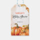 Lägg till en charmig touch till dina baby shower-favoriter eller -gåvor med dessa vackra höst-tema presentkort! Med en förtjusande akvarelldesign av frodiga pumpor och ömtåliga höstlöv, accentuerade med eleganta gyllene fläckar, kompletterar dessa kort din säsongsfirande perfekt. De ger ett underbart sätt att uttrycka tacksamhet till dina gäster eller märka speciella gåvor till den nya ankomsten. Lägg enkelt till ditt unika meddelande, namn och datum för att göra varje kort till en minnesvärd detalj på din speciella dag. Perfekt för höstens baby shower, rustika temaevenemang och könsrevealer, för att säkerställa att dina gåvor är inslagna med stil och värme.