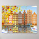 Amsterdams stadsvy (kanal, hus, båtar och gren i hösten träd med fallande löv). Tema för hösten färg: gult, orange, brun, blå.
