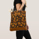 Vacker väska med en sömlös mönster av orange och brunt höst löv på mörkens bakgrund. En liten rektangel placeras längst upp i påsen med en mall som du kan använda för att anpassa ditt namn.