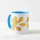 En vit ring mugg med pulverblå fälg och handtag som kompletterar den automatiska utformningen av färglöst ek löv.