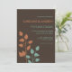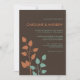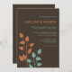 Dessa enkla, elegant, moderna bröllopsinbjudningar är redo att personalisera och ha två ben, eller grenar av löv i orange och teal på chokladbakgrunden. Dessa gren/löv-tematiska inbjudningskort är underbarare för Fall eller Höger bröllop.