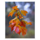 Titta noga på några röda löv och orangar med suddig bakgrund.