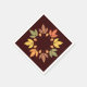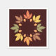 löv för gult, orange, brun och grönt som är placerade i en cirkel på en djup brun bakgrund.