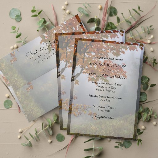 Ett strålande foto av höst löv i en skog. Den här menyn i bröllop ingår i en fullständig uppsättning.
