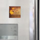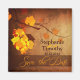 Kylmagneten i kvadrat med snyggt bröllop spara datum har en brunt och brunt vintage med en grapevine-gren överst lämnat som har viss gult, orange, rött och brunt höst löv och vissa "druvliknande" former hängande. På högerna grund kan man lätt anpassa detta med namn på bruden och brudgummen tillsammans med datumet för den kommande ceremonin i bröllop. Spara datum skrivs i orange vid grund i ett kursivt trendig.