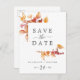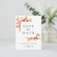 Detta höst löv vita och burgiga spara datum meddelande-vykort är perfekt för bröllop i oktober. Den roliga designen har en fantastisk handmålad vattenfärg höst löv i solnedgångshaden av gult, bränd orange och brinnrött.