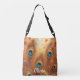 Denna livfulla, personliga höst-tema tote väska har en solfjäder av detaljerade påfågelsfjädrar badade i varmt solljus, omgivna av fallande lönnlöv.