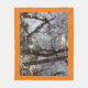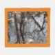 En höstmorgon prickar nederbörden i dammens yta och bryter reflektionen från träd. Gult höst löv flyter på yta.