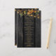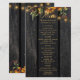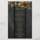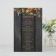 Bröllopsmottagningsmeny mall med rustika brända rostiga orange och gröna höstbotaniska växter på en mörkbrun lada träbakgrund med strängljus. Perfekt för ditt höst höst eleganta rustika lantliga utomhus trädgård eller lantbröllop.