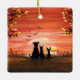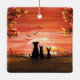 Två hundar och kattsilhuett tittar på solnedgången en höstkväll. Ljusstark, levande orange höst färger. Med två träd på båda sidor med fallande höst löv och fåglar som flyger mot solnedgången. Fall scenery Original Acrylic Painting Art gjord av Donna Leger for Irony Design. Alla rättigheter förbehållna.