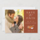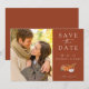 Detta eleganta platta bröllopskort med tidig anmälan har handmålade akvarellpumpor och löv på en terrakottabakgrund med brudens och brudgummens namn och bröllopsdatum.
