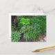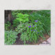 Detta frodiga vykort för trädgårdar skapades från ett originalfoto av mina hosta-växter som växer runt mitt skuggiga träd. Den lila blomman är en spindelört och denna skogsväxt ser snygg ut bland de gröna bladen. Ett bra vykort för affärs- eller personligt bruk.