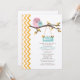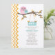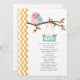 En modern barnduschinbjudan i snyggt med en illustration av ett rosa mamma uggla med ett blått baby uggla på sitta på en träd gren med höst löv. Orange ombre zigzag-design på lämnat. Anpassa texten med information om tillfälle.