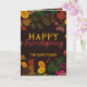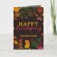 Bjud in din valda familj till bordet med ett kort som är lika varmt som ert samankomst. Denna design ramar in ditt meddelande med en skörd av handritade höstblad, ekollon och bär, mot en rik, mörk bakgrund. De livfulla guld- och djuprosa typsnitten är en glädjefylld färgklick. Detta kort kan fullständigt anpassas på framsidan och insidan för en personlig touch.