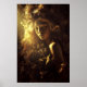 En ung flicka med lysande hy och milda ögon blickar mjukt framåt, hennes ansikte och axlar insvepta i en invecklad kokong av torra höstlövar, tistlar, fröbaljor och sköra blommor. Gyldenröda lockar smälter naturligt in i den vilda organiska krona som omger hennes huvud som en levande gloria. Dramatiskt varmt gyllene ljus strömmar nerifrån ovan, kantbelysande hennes drag och skapa rika kontraster mot djupa skuggor och en mörk bakgrund. Kompositionen frammanar skör förundran, säsongsmässig förvandling, återfödelse genom förfall, sagolik melankoli, tyst styrka och naturens ömma poesi som återtar oskuld – perfekt för stämningsfulla sovrum, fantasiläsningsvrår, meditationshörn, barns rum med djup, mörk