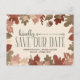 Denna rustika spara-datum-postkort har handskriven typografi omgiven av höstlöv. Ek- och lönnlöv är färgade i nyanser av salvia grön, roströd, dammig rosa och ljust sand.