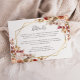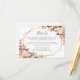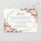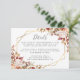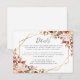 Detta eleganta moderna bröllopsdetaljkort har en gyllene geometrisk ram dekorerad med akvarellblommor i höstskuggor av bränd orange, persika, rodnad och burgunder på en vit bakgrund. Den anpassningsbara texten kombinerar kolgrå fantasifull handskrift och kopparstick-fontäner. Baksidan är solid vit.