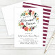 Denna frodiga och romantiska inbjudan till repetitionskvällens middag har en komplett akvarellblomsterkrans som spricker av höstens blommor - burgunderrosor, korallfärgade dahlior, orange ranunkel och rosafärgade blommor med rik grönska. Djärv kalligrafiskrift läser "Repetitionskvällens Middag" inuti kransen för en dramatisk mittpunkt. Alla namn, datum och evenemangsuppgifter är helt redigerbara. Ett fantastiskt val för en höst- eller skördeinspirerad bröllpsrepetition.
